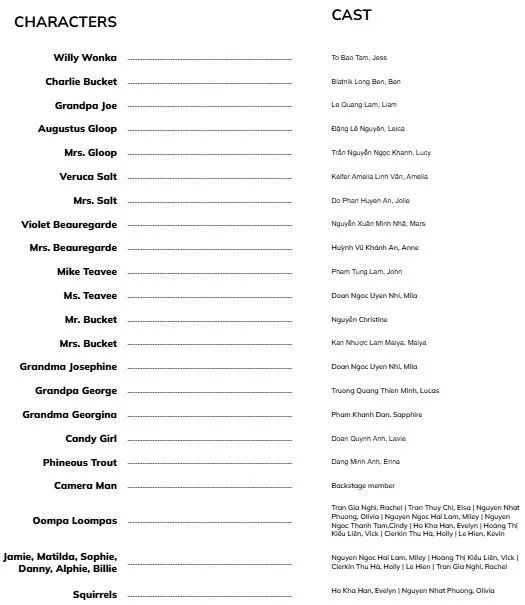 The play will span from 17:30 to 19:30, 28/02 for primary students only, and 01/03 for all grades. It will take place inside Wellspring Saigon's auditorium. There will be 3 ticket ranks to choose from: Candy Box, Chocolate Deluxe, and Golden Ticket. Early Bird tickets will be sold online from the 20th of January to the 6th of February, providing discounts. Then, from the 21st of January onwards, offline tickets will be sold during lunch and after school hours on the ground floor, behind the auditorium. You can also purchase tickets after 25/01 on WISers Communication’s and The Business Venture Instagram (id: wiserscommunication / _ws.thebusinessventure_) or the school website.
